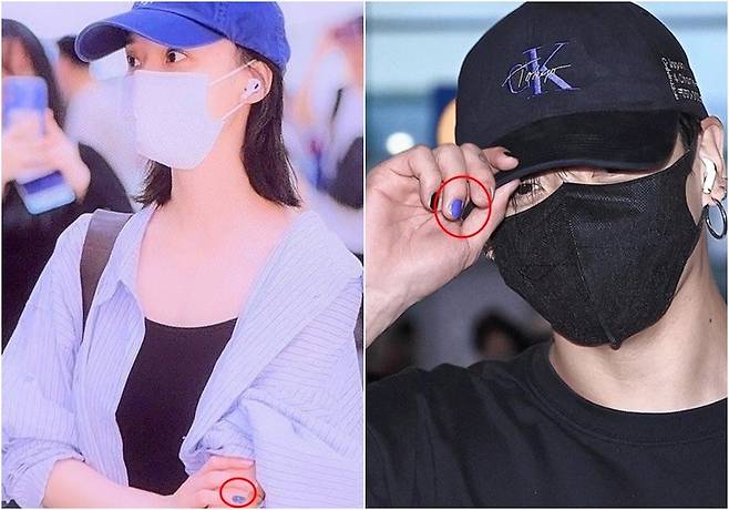 누리꾼들은 두 사람의 팔에 새겨진 타투가 같은 디자인이라는 것과 더불어 손가락에 칠한 네일아트, 정국의 에스파 콘서트 방문 목격담 등을 근거로 들고 있다.