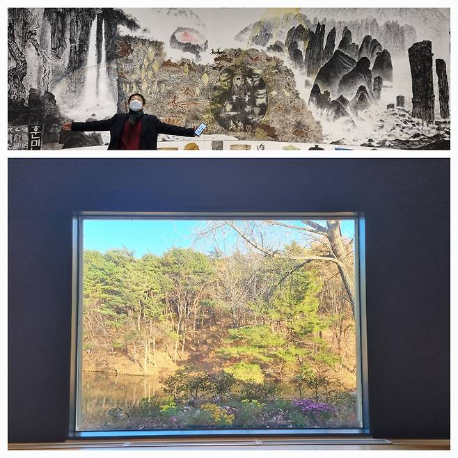 | ▲ 박대성 화백의 대작과 포토존 박대성 화백의 대작에는 단군신화에서 고구려 벽화, 금강산, 훈민정음에 이르기까지 우리 문화의 기원이 장대하게 표현되어 있다. |