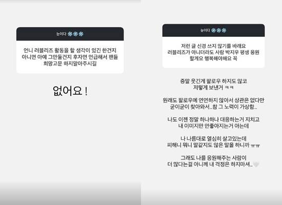 한 팬은 "러블리즈 활동을 할 생각이 있긴 한 건지 아예 그만둘 건지 후자면 언급해서 팬들 희망고문 하지 말아 주시길"이라고 남겼고, 진은 "없어요!"라고 답했다.