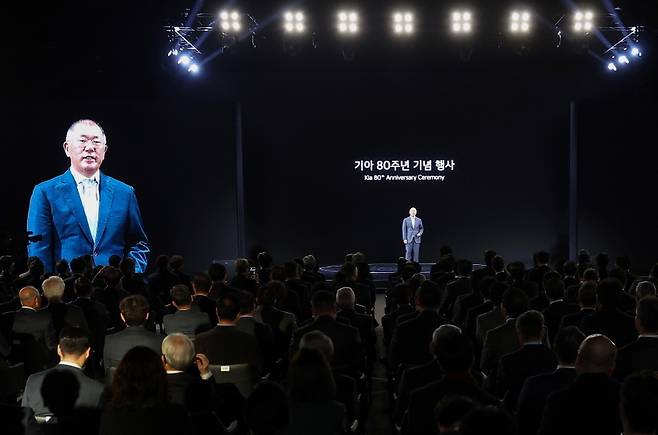 [정의선 현대차그룹 회장이 5일 경기 용인시 기아 비전스퀘어에서 열린 기아 80주년 기념식에서 발언하고 있다. (사진=연합뉴스)]