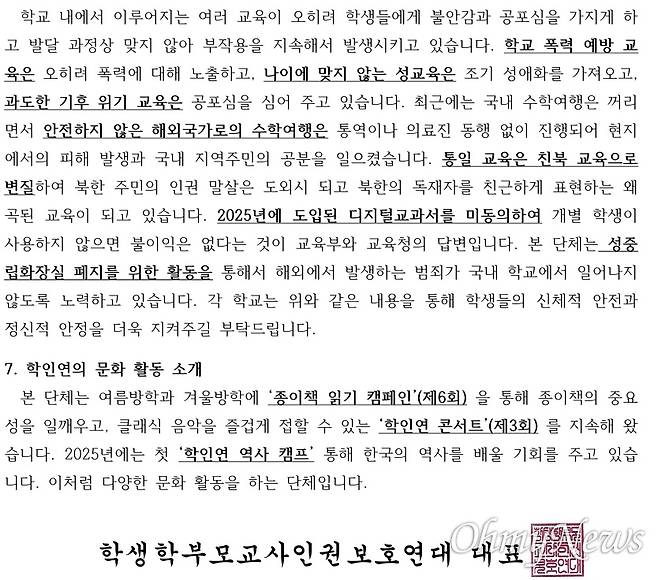 이어 이 단체는 "학교폭력 예방교육은 오히려 폭력에 대해 노출하고, 나이에 맞지 않는 성교육은 조기 성애화를 가져오고, 과도한 기후 위기 교육은 공포심을 심어주고 있다"라면서 "안전하지 않는 해외국가로의 수학여행은 국내 지역 주민의 공분을 일으켰다. 통일교육은 친북교육으로 변질하여 북한의 독재자를 친근하게 표현하는 왜곡된 교육이 되고 있다"라는 주장을 펼쳤다. 그러면서 "각 학교는 위와 같은 내용을 통해 학생들의 신체적 안전과 정신적 안정을 더욱 지켜주길 부탁드린다"라고 요구했다.