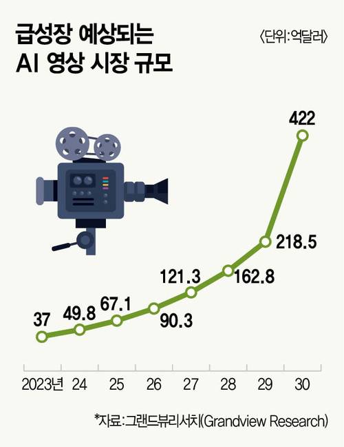 AI 도구만 있으면 블록버스터급 영상도 1인 제작이 가능해졌다. 시간과 비용이 획기적으로 줄어드는 만큼, 콘텐츠 기업은 요즘 너도나도 AI 스터디에 빠져 있다. 글로벌 AI 영상 시장도 급성장 중이다. 그랜드뷰리서치에 따르면, 2023년 37억달러였던 시장 규모는 2030년 422억달러까지 커질 전망이다.