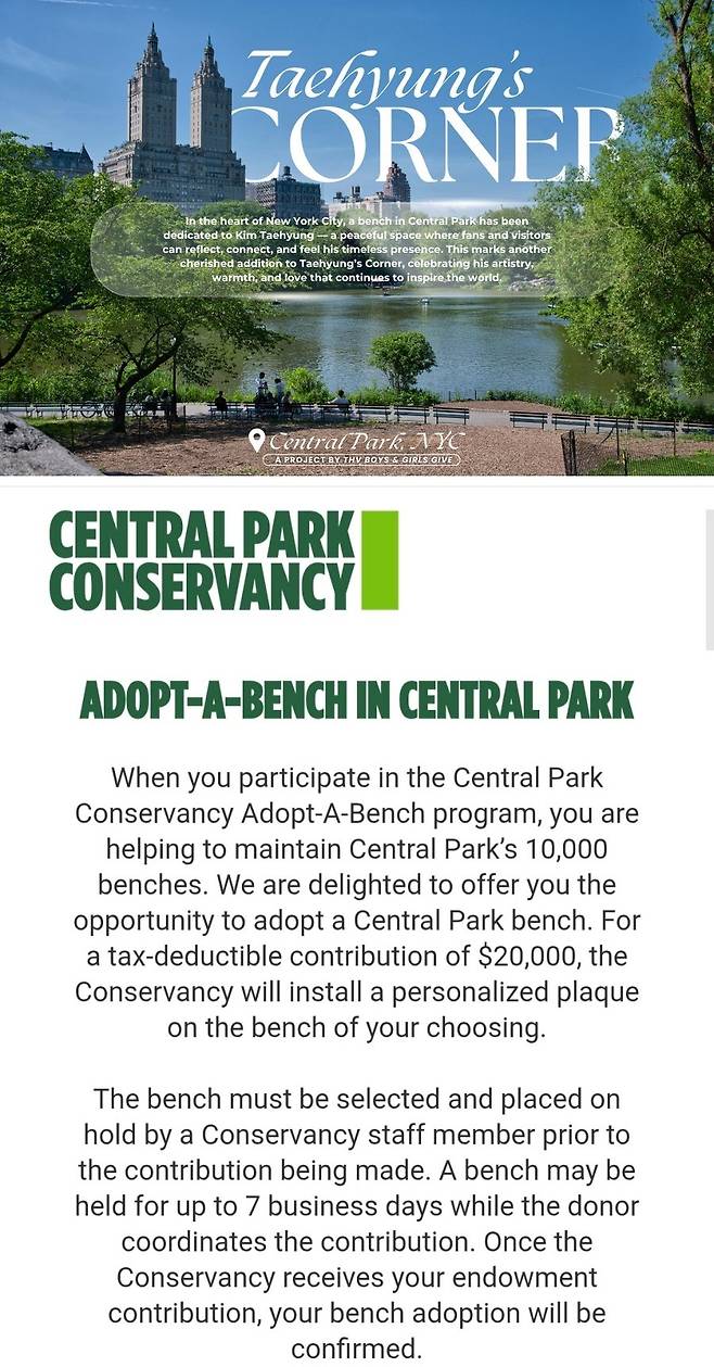 뉴욕 센트럴파크 한가운데, 방탄소년단(BTS) 뷔의 이름을 새긴 벤치가 조용히 자리를 잡았다.
