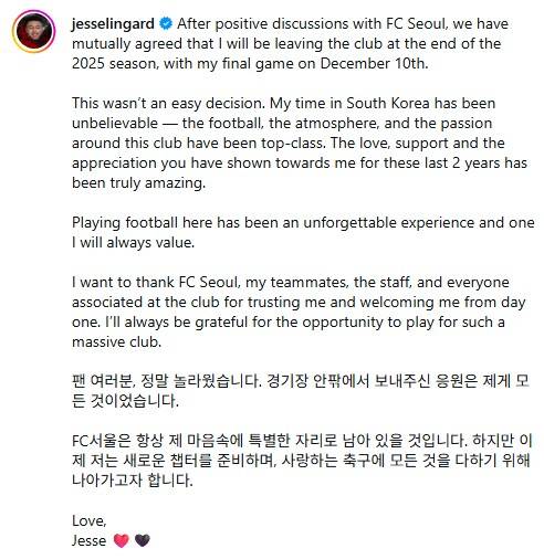 이어 "경기장 안팎에서 보내주신 응원은 저에게 모든 것이었다. FC서울은 제 마음 속에 특별한 자리로 남아있을 것"이라며 "새로운 챕터를 준비하며 사랑하는 축구에 모든 것을 다하기 위해 나아가고자 한다"고 덧붙였다.