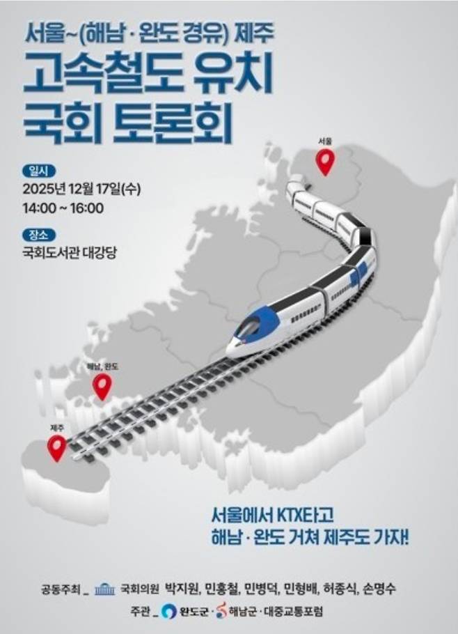 전남 해남군은 국회도서관 대강당에서 해남과 완도를 경유해 제주까지 연결하는 서울~제주 간 고속철도 구축 가능성과 발전 전략 토론회를 개최한다고 밝혔습니다.