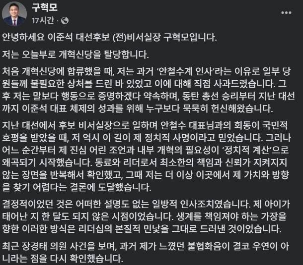 5일 구 위원장은 자신의 페이스북에 "저는 오늘부로 개혁신당을 탈당한다"라며 "처음 개혁신당에 합류했을 때, 저는 과거 '안철수계 인사'라는 이유로 일부 당원들께 불필요한 상처를 드린 바 있었고 이에 대해 직접 사과드렸다. 그 후 저는 말보다 행동으로 증명하겠다 약속하며, 동탄 총선 승리부터 지난 대선까지 이준석 대표 체제의 성과를 위해 누구보다 묵묵히 헌신해왔다"고 회고했다.