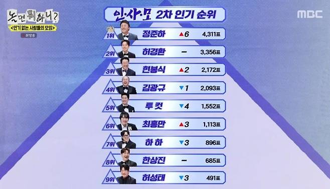 그런 가운데 대망의 2차 순위가 공개됐다. 1위였던 투컷은 5위로 떨어졌다. 4위는 김광규, 3위는 현봉식이었다. 6위는 최홍만, 7위는 하하인 상황. 2위는 허경환, 1위는 정준하였다. 진정성 있던 개인기 덕에 반전을 이룬 정준하는 기쁨을 만끽했다. 유재석은 "주식으로 따지면 급등락이 굉장히 심하다. 지금 상한가를 친 거다"라고 밝혔다.