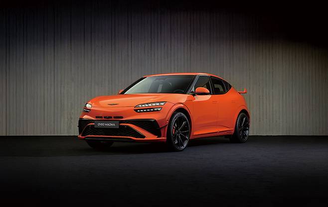 이번에 공개된 GV60 마그마는 고성능을 강조하기 위해 과장하거나 과시하는 대신 ‘보이지 않는 힘’의 존재감을 표현하는 데 초점을 맞췄다. 전면부는 기존 GV60보다 전폭을 넓히고 전고를 낮춰 안정적인 자세를 구현하면서 ‘질주 본능’을 강조했다.