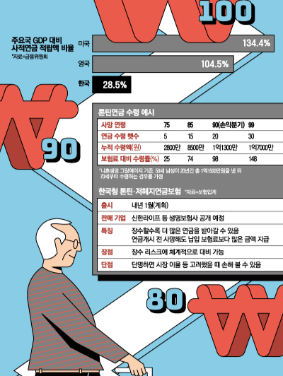 국민들의 장수에 대한 걱정을 줄이기 위한 연금보험 상품이 내년 초 나온다. 신한라이프를 필두로 주요 생명보험사가 오래 살수록 더 많은 연금을 주는 톤틴·저해지연금보험을 선보인다. 보험을 향한 젊은 층의 관심이 점점 떨어지는 시대. 생보사도 톤틴연금이 분위기를 반전할 계기가 될지 기대하고 있다.