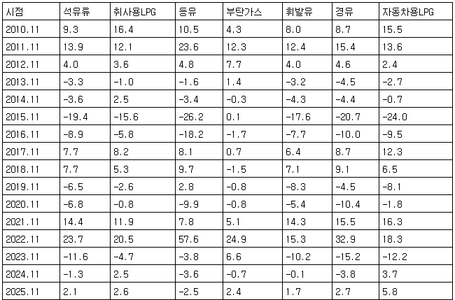 [표] 1∼11월 누계 기준 석유류 품목별 작년 동기 대비 물가상승률(단위:%)