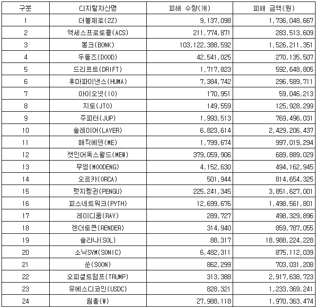 피해 금액 기준으로는 '솔라나(SOL)'가 189억8천822만원(42.7%)으로 가장 컸다. '펏지펭귄' 38억5천162만원(8.7%), '오피셜트럼프' 29억1천763만원(6.6%) 등이 그 뒤를 이었다.