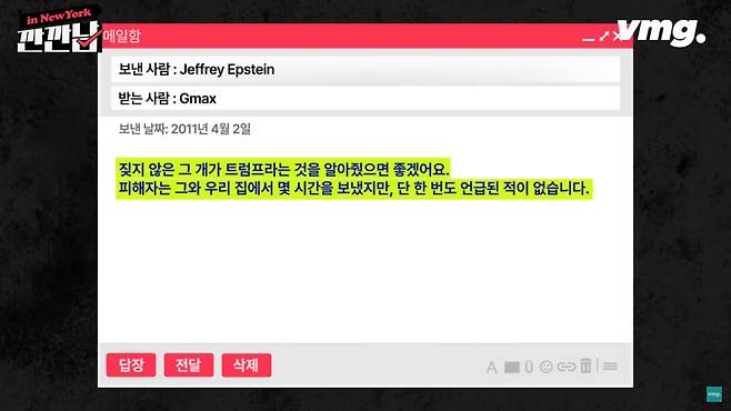 첫 번째 이메일은 2011년 4월입니다. 제프리 엡스틴이 약간 꼬리가 밟혀서 감옥에 짧게 갔다 온 직후에 보낸 이메일인데 '짖지 않은 그 개가 트럼프라는 걸 알아줬으면 좋겠어요. 피해자는 트럼프와 우리 집에서 몇 시간을 보냈지만, 단 한 번도 언급된 적이 없다.' 걔들은 원래 짖는데 안 짖은 개가 하나 있어요. 언급되지 않은 개 한 마리가 바로 트럼프라는 겁니다.