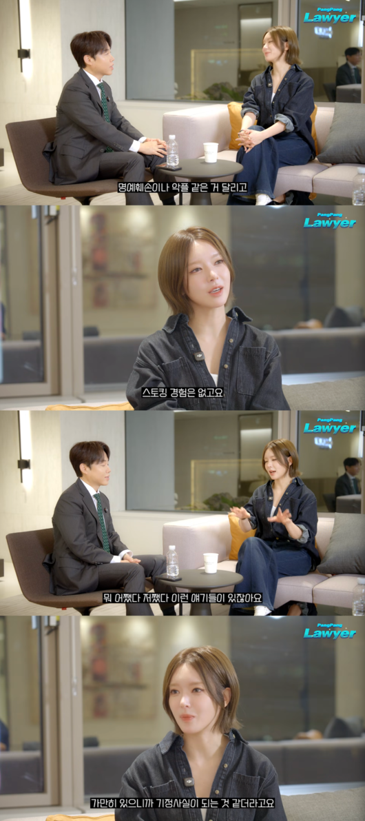 이날 김태형 변호사는 초아를 초대해 이야기를 나누며 "명예훼손이나 악플 같은 거 달리고 스토킹에 시달리는 그런 친구들 너무 많이 봤다. 혹시 그런 경험 있으세요?"라고 물었다.