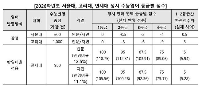 하지만 가∙감점 방식을 사용하는 대학 간에도 등급 간 점수 차가 다르고, 수능 영역별 반영 비율에 포함하는 대학도 저마다의 환산점수를 이용하기 때문에 단순히 이분화해서 생각해서는 안 된다. 예를 들어 감점을 적용하는 고려대의 경우 영어 1·2등급 점수 차이는 3점이지만 15%의 반영 비율을 적용하는 동국대는 전형 총점 중 1점도 채 되지 않는다.
