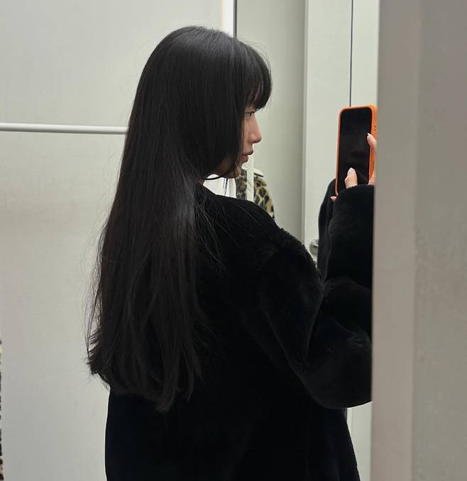공개된 사진 속 문가영은 블랙 퍼 재킷을 입고 거울 앞에서 포즈를 취하고 있다.