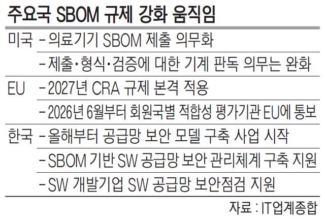 오픈소스 활용이 일상화되고 사이버 공격의 강도가 높아지자 미국, 유럽연합(EU) 등 주요국에서는 ‘소프트웨어 자재 명세서’(SBOM) 제출·관리를 의무화하는 등 소프트웨어 공급망 관리 지침을 강화하는 추세다.