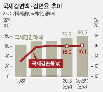 최근 국회에서 확정된 내년 예산안 및 예산부수법안을 보면, 내년 국세감면액은 약 80조5천억원에 이를 것으로 7일 전망됐다. 국세수입총액 대비 감면금액을 가리키는 국세감면율은 16.1%로, 올해 잠정치(16.0%)보다 소폭 오를 것으로 예상된다.
