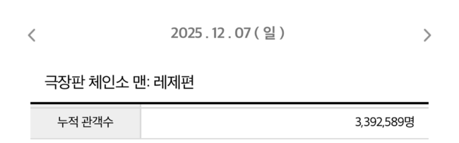 장기 흥행세를 굳건히 이어가고 있는 '극장판 체인소 맨: 레제편'이 12월 7일(일) 누적 3,392,589명 관객을 동원하며 2025년 전체 박스오피스 5위에 올랐다. 이는 톰 크루즈 주연의 할리우드 영화 '미션 임파서블: 파이널 레코닝'(3,392,542명)의 최종 관객 수를 넘은 기록으로 '극장판 체인소 맨: 레제편'의 폭발적인 흥행 저력을 다시 한번 입증했다.