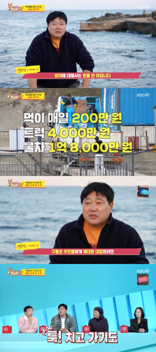 양준혁은 4m 수심의 양식장에 들어가 방어를 한쪽으로 몰고, 몰린 방어들을 육지에서 팀장들이 뜰채로 잡을 계획을 세웠다. 어마어마한 크기의 방어에 양준혁은 “어느 때는 미사일처럼 지나갈 때도 있다. 툭 치고 간다”고 말했다.