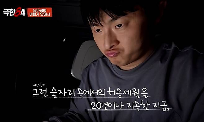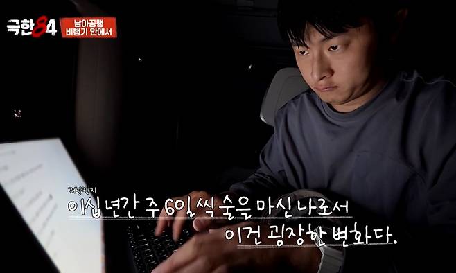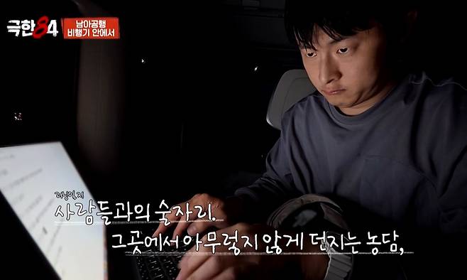 5일 MBC 예능 프로그램 '극한84' 미공개 영상이 공개됐다. 해당 영상에는 남아프리카공화국에서 열리는 '빅5 마라톤' 출전을 앞두고 비행기 안에서 홀로 글을 적고 있는 기안84의 모습이 담겼다. 예능에서 보여준 장난기 가득한 모습과 달리 진지하게 생각을 정리하는 그의 모습이 눈길을 끌었다.