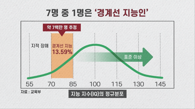 경계선 지능인은 지능지수 71~84 사이로 지적장애의 기준보다 높습니다. 국내 인구의 13.6% 7명 중 1명 수준으로, 전체 700만 명으로 추정됩니다.