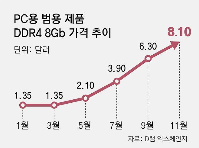 일반 서버에는 더블데이터레이트(DDR)5와 같은 범용 메모리가 주로 사용된다. 맞춤형 제작인 HBM과 달리 DDR5 등 범용 메모리는 공급업체들이 대량 양산해 그때그때 수요자들이 찾아가는 방식으로 거래된다. 여기에 삼성전자와 SK하이닉스가 HBM 위주로 생산 라인을 확대한 결과 기존의 범용 제품의 공급량이 줄어드는 상황이 벌어졌다. DDR5의 이전 세대인 DDR4의 경우 PC용 제품(8Gb) 1개의 가격이 11월 말 기준 8.10달러로 올 초(1.35달러) 대비 6배가 됐다.