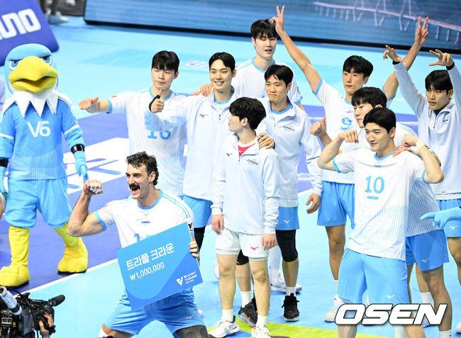 대한항공 선수들도 함께 시상식을 즐겼다. 기념촬영을 하는 러셀의 뒤에서 환호와 세리머니를 함께하며 코트를 더 뜨겁게 달궜다. 최근 상승세의 분위기를 보여주듯 유쾌한 장면을 연출했다. /sunday@osen.co.kr