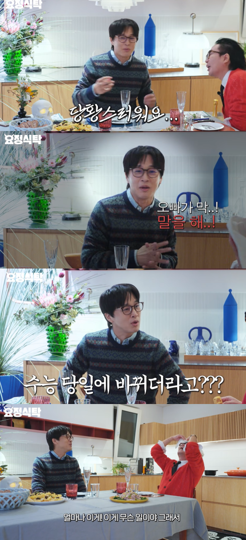 차태현은 최근 고등학교 3학년인 첫째 아들 수찬 군의 수학능력시험 응시로 살얼음판을 걸었다. 이에 '요정재형' 출연도 조심스러웠다. 정재형은 "내가 밥 먹자고 그랬더니 수찬이 끝나고 만나자고 하더라"라며 그 이유를 설명했다.