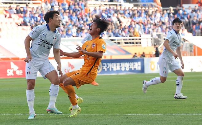 | ▲ 뼈 아픈 파울 7일 오후 서귀포시 제주월드컵경기장에서 하나은행 K리그 2025 승강 PO 2차전 제주SK와 수원삼성의 경기 전반 수원 이기제가 파울을 범하고 있다. |
