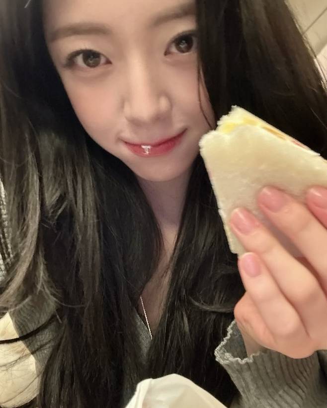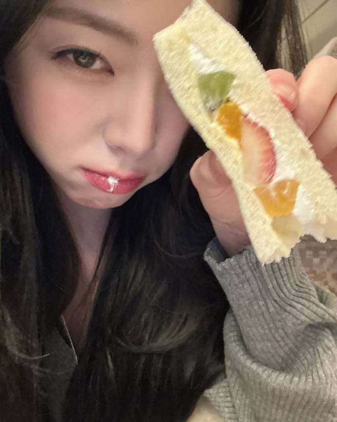 일상 컷에서는 과일 샌드위치를 들고 생크림을 묻힌 모습을 보여줘 귀여운 반전 매력까지 챙겼다.