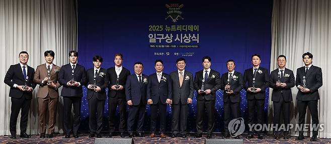 왼쪽부터 이종열 삼성 라이온즈 단장, 송성문, 원태인, 박찬형, 안현민, 김광수 일구회 회장, 김형대 뉴트리디데이 대표, 허구연 총재, 오승환, 전광렬 경남고 감독, 권영철 KBO 심판위원, 김정준 LG트윈스 수석코치, 이정후. 2025.12.8