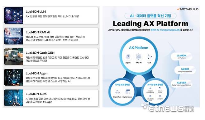 기존 연계·데이터 플랫폼 역량에 더해. 자체 'LLaMON LLM'을 기반으로 'RAG AI' '에이전트 빌더' '코드자동 생성' 'MLOps 플랫폼' 등 플스택 AI 솔루션을 출시해 'AX 플랫폼' 시장을 선도하고 있다.