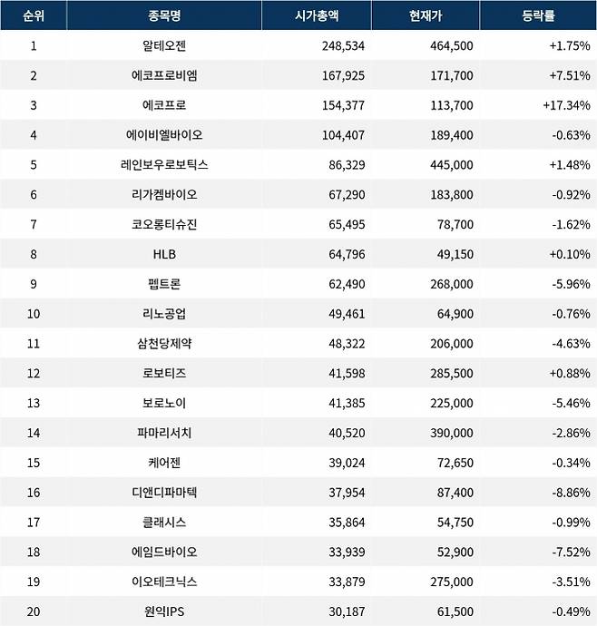 8일 한국거래소에 따르면, 시가총액 1위 종목인 알테오젠(196170)은 현재가 464,500원으로 전 거래일 대비 1.75% 상승하고 있다. 시가총액은 248,534억원이며, 외국인 비율은 14.11%이다. 거래량은 380,102주로 기록되었고, PER은 197.83배, ROE는 29.52%이다. 한편, 2위인 에코프로비엠(247540)은 현재가 171,700원으로 7.51% 상승하며, 거래량은 1,188,070주를 기록하고 있다. 시가총액은 167,925억원이며, 외국인 비율은 12.38%로 확인된다. PER은 5,365.62배, ROE는 -6.26%이다.
