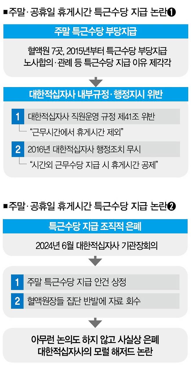 ![대한적십자사는 일부 혈액원이 주말·휴일 근무 시 휴게시간에 특근수당을 지급하는 것을 인지하고도 계속해서 은폐했다.[사진|뉴시스]](https://img1.daumcdn.net/thumb/R658x0.q70/?fname=https://t1.daumcdn.net/news/202512/08/thescoop1/20251208133627932pmyw.jpg)