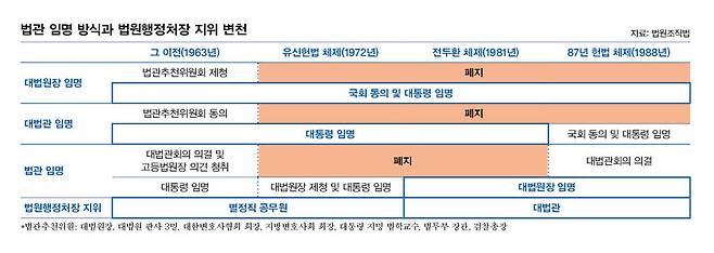 대법원장·대법관을 임명할 때 대법원장·대법관 3명 등 법원 내부 인사는 물론 변호사협회·법학교수 등 외부 인사들도 참여하는 법관추천위원회를 거쳐야 했던 제도는 1972년 유신헌법 개정 때 사라졌다. 법관을 임명할 때 의무화했던 ‘고등법원장 의견 청취’ 절차도 이때 함께 사라졌다. ㄴ변호사는 “제4공화국 때 대통령이 대법원장을 통해 법원 인사권을 휘두르려는 목적으로 대법원장 권한을 막강하게 키워놨다. 대법관이 법원행정처장을 맡게 된 것은 제5공화국 때부터”라며 “내부 견제나 민주적 정당성 확보 장치 없이 대법원장·법원행정처장 등 몇몇 법관의 비정상적이고 이례적인 권한 강화를 ‘사법부 독립’이라고 포장해선 안 된다”고 말했다.