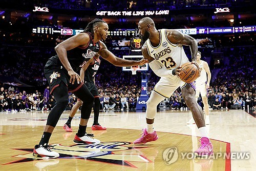 8일 미국 펜실베니아주 필라델피아 스피니티 모바일 아레나에서 열린 NBA 2025-2026시즌 정규리그 LA 레이커스와 필라델피아 세븐티식서스의 맞대결. 르브론이 부활의 신호탄을 쐈다.
