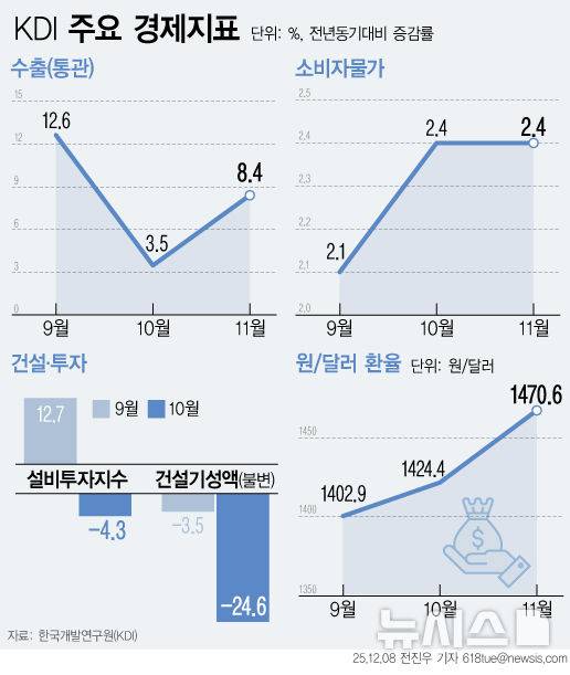 [서울=뉴시스] 8일 한국개발연구원(KDI)이 발표한 '12월 경제동향'에서 최근 우리나라 경제와 관련해 "건설업 부진이 지속되고 있으나, 소비를 중심으로 완만한 경기 개선세는 유지되는 모습"이라고 평가했다. (그래픽=전진우 기자)
