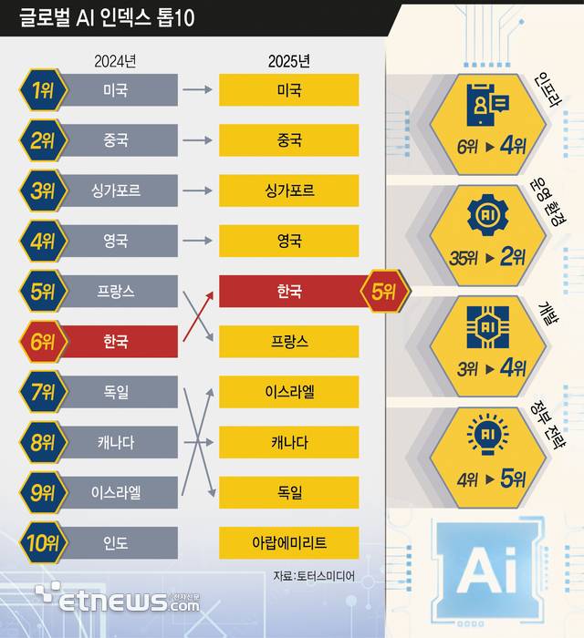 8일 학계·업계에 따르면 우리나라는 영국 언론기관 토터스미디어와 옵서버가 세계 93개국의 AI 역량과 경쟁력을 분석한 '글로벌 AI 인덱스 2025' 평가에서 프랑스를 밀어내고 종합 5위를 차지했다.