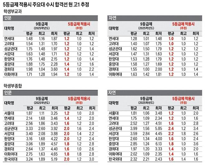 현 고1부터 고교 내신은 9등급제에서 5등급제로 바뀌었다. 1등급은 상위 4%에서 10%로, 2등급은 상위 11%에서 34%로까지 크게 확대됐다. 1등급 구간이 넓어지면서 학생 입장에선 본인 노력에 따라 1등급을 받을 기회는 많아진 셈이다. 하지만 동시에 1등급 구간이 10%까지 확대되면서 평균 1등급대 성적에 들지 못하면 인서울 수시 합격이 쉽지 않을 것이라는 분석도 나온다. 현 고1 5등급제 기준으로 주요 대학 수시 합격선은 어떤 변화를 겪을까. 9등급제로 실시한 2025학년도 주요 대학 수시 합격선을 5등급제 기준으로 분석해본다.