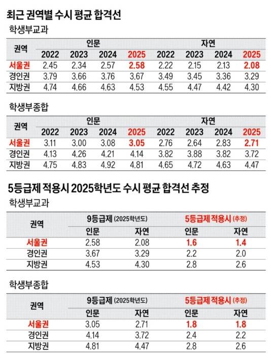 이처럼 내신 등급 체계가 바뀌면 수시 내신 합격선도 큰 변화를 겪을 수밖에 없다. 수시 학생부교과 전형에서 2025학년도 서울권 인문계 합격선 평균은 2.58등급을 기록했는데, 이를 5등급제 기준으로 환산하면 1.6등급으로 추정된다. 자연계 2.08등급은 1.4등급으로 분석된다. 경인권 인문 3.67등급은 2.2등급으로, 자연 3.29등급은 2.0등급으로 전망된다.