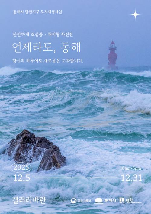 동해시는 발한지구 도시재생 현장지원센터 내 갤러리바란에서 오는 31일까지 채지형·조성중 작가의 감성 사진전 ‘언제라도, 동해’를 개최한다. 이번 전시는 바다가 전하는 새로움과 회복의 메시지를 주제로, 시민과 방문객에게 위로와 영감을 선사할 예정이다.