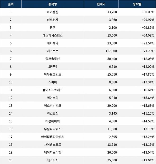 6위 에코프로(086520)는 종가 117,500원으로 21.26% 상승 마감했다. 7위 링크솔루션(474650)은 종가 50,400원으로 18.03% 상승 마감했다. 8위 코렌텍(104540)은 종가 6,810원으로 18.02% 상승 마감했다. 9위 아우토크립트(331740)는 종가 15,250원으로 17.85% 상승 마감했다. 10위 스피어(347700)는 종가 8,660원으로 17.34% 상승 마감했다.