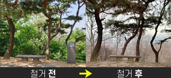 | ▲ 김대중 대통령이 일산 사저에 살며 자주 산책했던 정발산 정상에는 김대중 벤치가 있었다. 고양시는 이 벤치 옆에 김대중 대통령이 자주 찾아던 장소라는 표지판을 세웠지만 이동환 시장이 취임하면서 이 표지판 역시 없어졌다. 사진은 철거전과 철거 후 모습. |