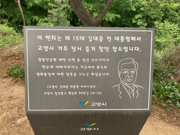 | ▲ 김대중 대통령이 일산 사저에 살며 자주 산책했던 정발산 정상에는 김대중 벤치가 있었다. 고양시는 이 벤치 옆에 김대중 대통령이 자주 찾아던 장소라는 표지판을 세웠지만 이동환 시장이 취임하면서 이 표지판 역시 없어졌다. |