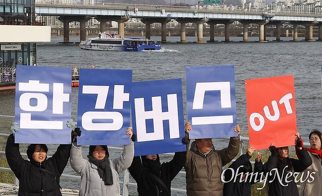 | ▲ 서울환경연합 소속 회원들이 11월 17일 오전 서울 여의도 한강버스 선착장 앞에서 기자회견을 열어 한강버스 사업의 재검토를 촉구하고 있다. |