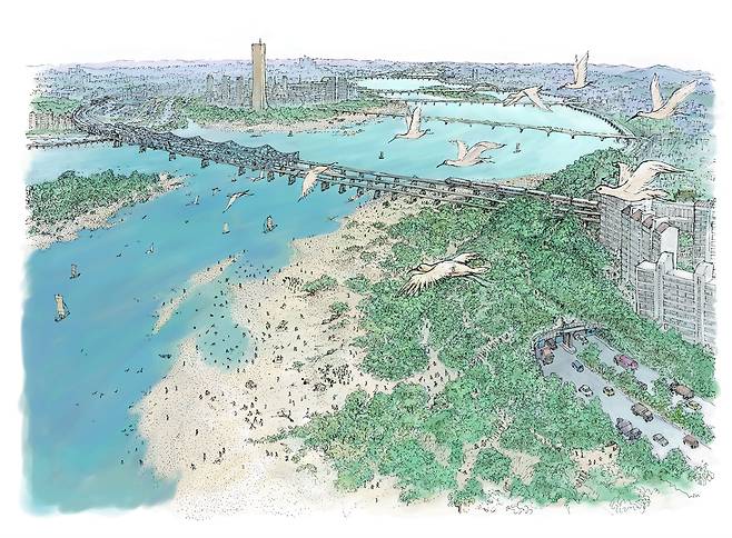 | ▲ 재자연화된 한강 현재의 동부이촌동 부근 한강을 재자연화했을 때의 상상도. 옛 노들 백사장이 돌아온다. |