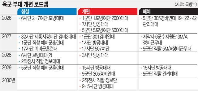 육군은 이를 포함해 향후 5년간 9개 부대 창설, 12개 부대 개편, 6개 부대 해체를 담은 대대적인 병력체제 개편에 나선다.