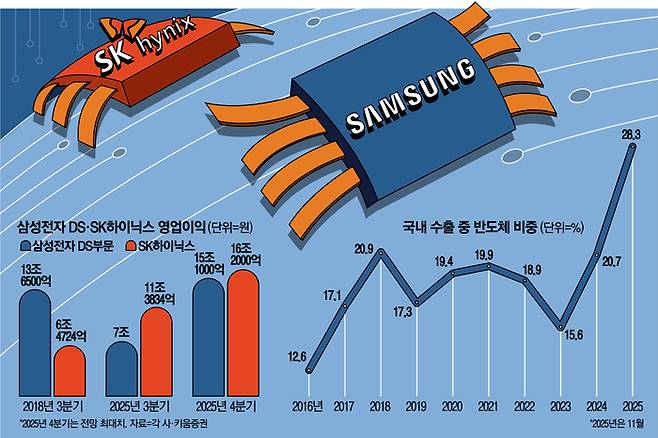 다만 두 기업 모두 반도체 슈퍼사이클(초호황)의 중심에 서면서 한국 기업 역사상 최대 규모 분기 영업이익을 기록할 전망이다. 기존 기록은 삼성전자가 2018년 3분기에 써낸 17조5700억원이다. 당시 삼성전자 DS 부문 영업이익은 13조6500억원 규모였다. 일각에서는 삼성전자의 경우 스마트폰을 포함한 세트 부문이 계절적 비수기라는 점을 변수로 꼽고 있지만 DS 부문의 수익성 개선이 전사 실적을 이끌 것이라는 전망이 우세하다.