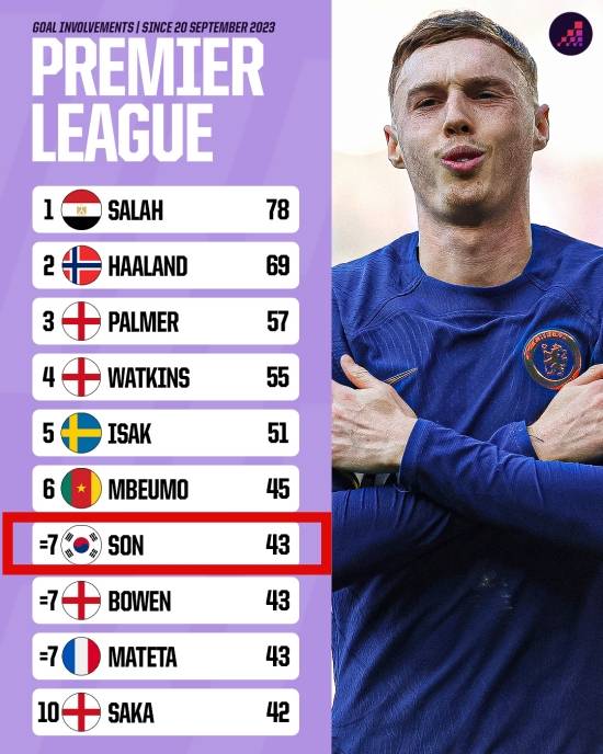 2023-2024시즌 17골을 넣었던 손흥민은 파머보다 적은 43개의 공격 포인트로 제러드 보웬(웨스트햄 유나이티드), 장 필립 마테타(크리스털 팰리스)와 동률을 이뤘다.
