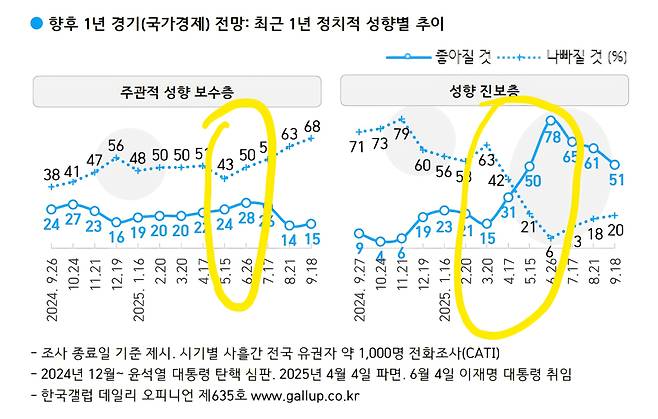 보수층부터 살펴볼까요? 대통령 선거가 치러지고 처음 실시된 갤럽의 6월 26일 조사부터 주관적 성향 보수층의 50%는 경제가 나빠질 것이라고 응답했습니다. 그 이후 계속 치솟기만 하지요. 이 조사가 공표된 게 9월 19일인데 9월 18일까지 69%의 보수 응답자는 향후 1년 한국 경제는 나빠질 것이라고 응답합니다. 매우 부정적입니다.